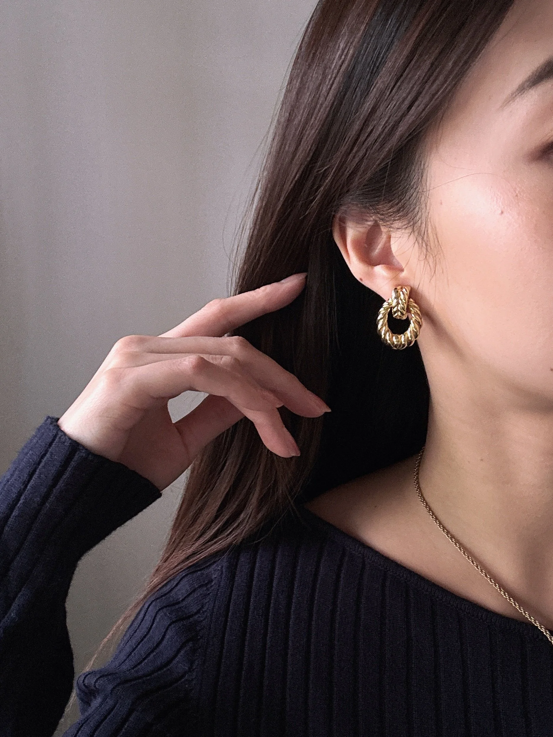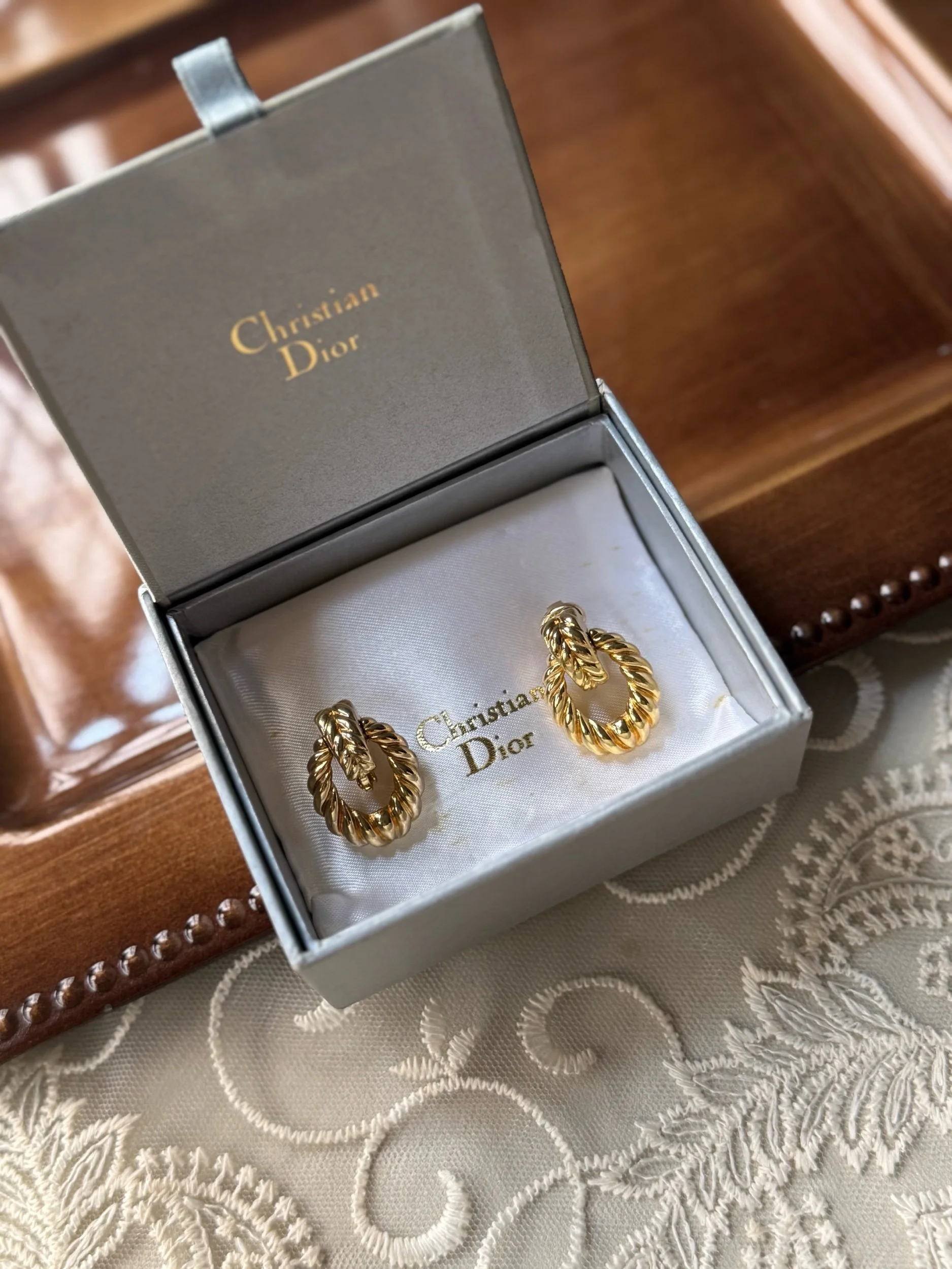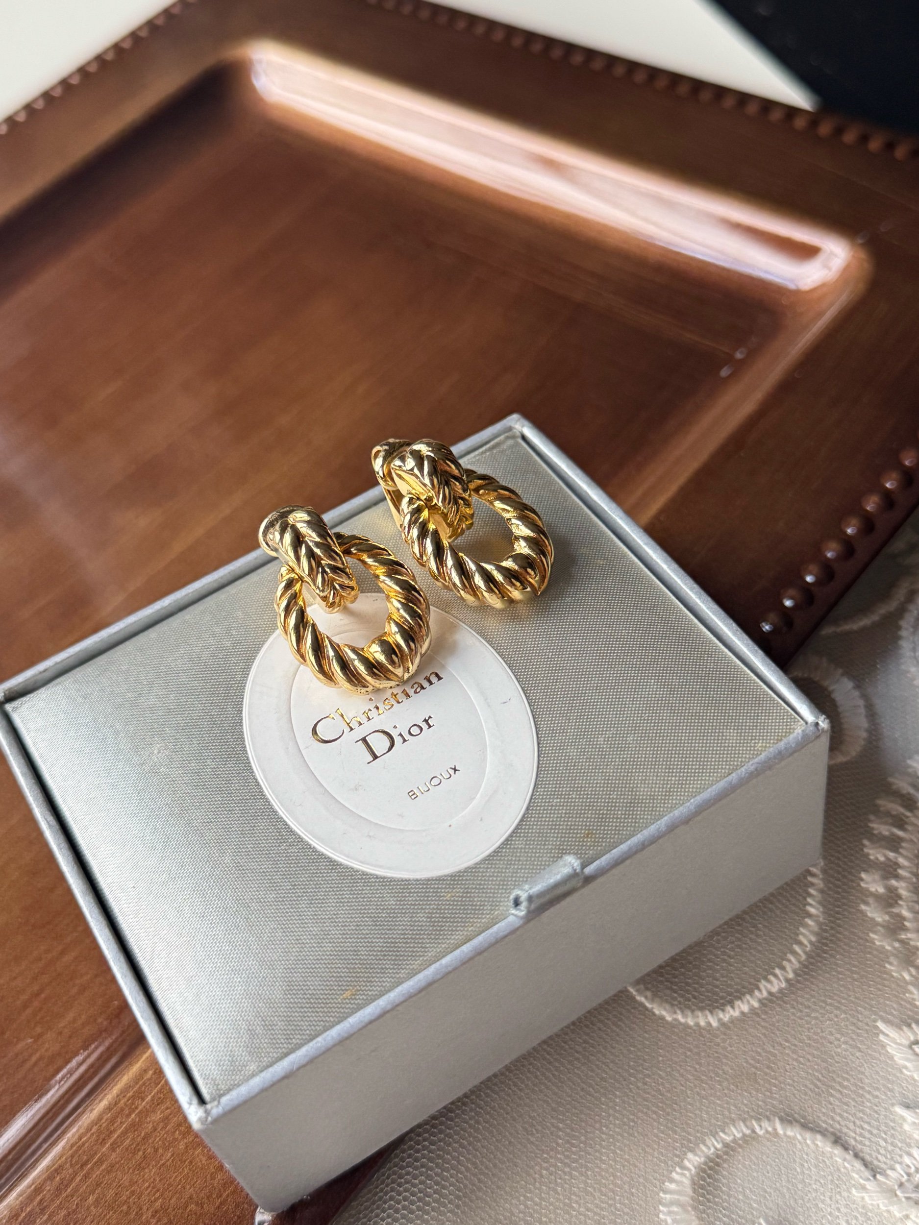這對Christian Dior鍍金耳夾設計經典,採用扭繩紋理打造,增添了立體感和優雅氣質。耳夾以環形結構為主,線條流暢,散發奢華與精緻的時尚感,適合各種場合佩戴,凸顯個人風格。